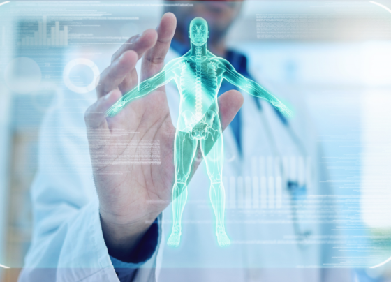 Canva/Peopleimages.com – YuriArcurs Imagem ilustrativa de um médico interagindo com um holograma do corpo humano Acessibilidade L …