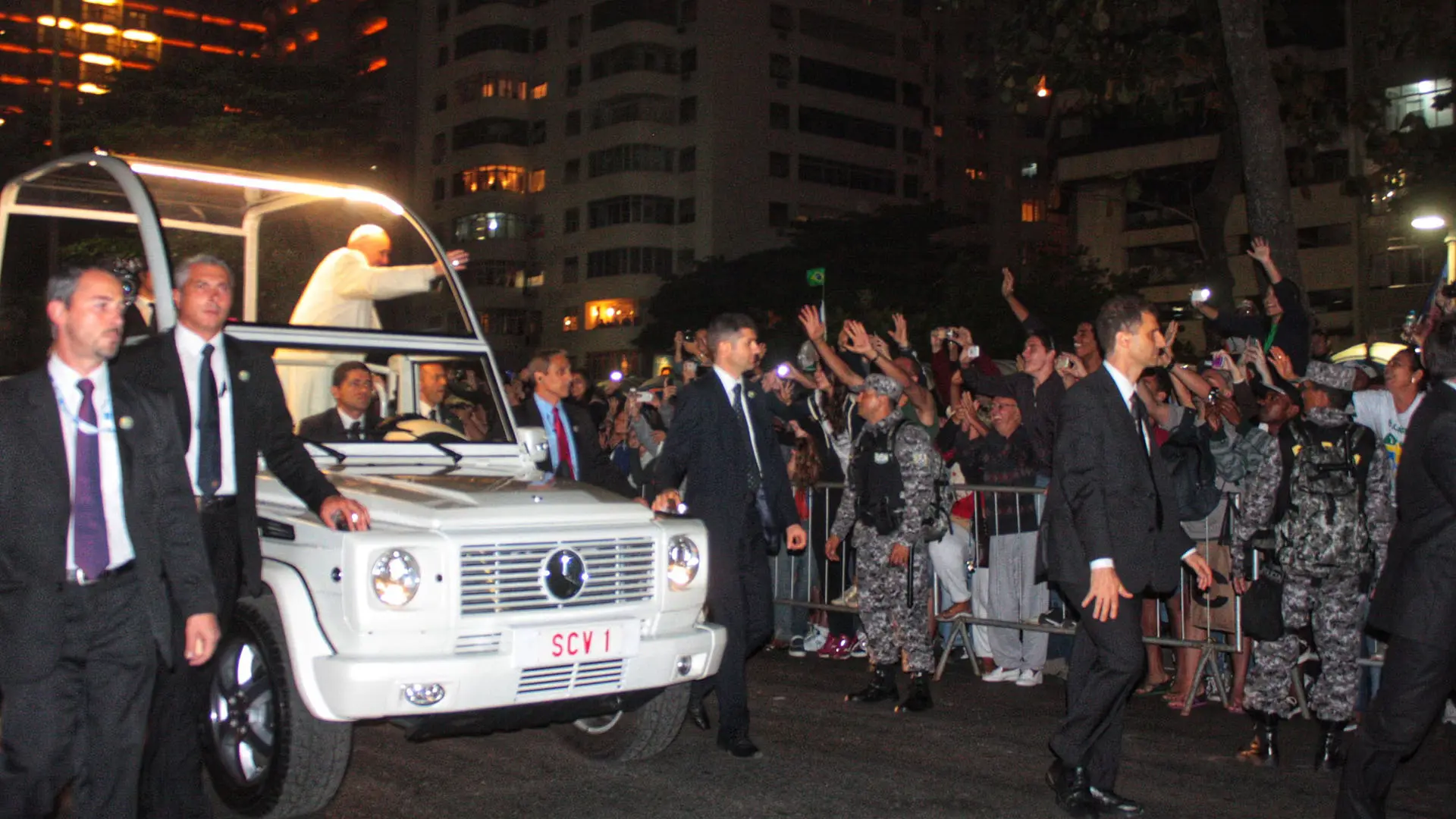Era sábado à noite e o papa passava em um corredor pela Avenida Atlântica, em Copacabana, na noite de sábado, 27 de julho, quando aconteceria a Vigília da Juventude. Desembarcou no Forte de Copacabana, e em meio à avenida lotada de fiéis e incontáveis seguranças, atravessava a orla em seu Papamóvel.