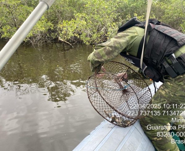 As armadilhas, do tipo “covo”, estavam fixadas à margem do mangue e foram encontradas em desacordo com a legislação pesqueira vigente. Os peixes capturados nas armadilhas foram devidamente soltos no local.