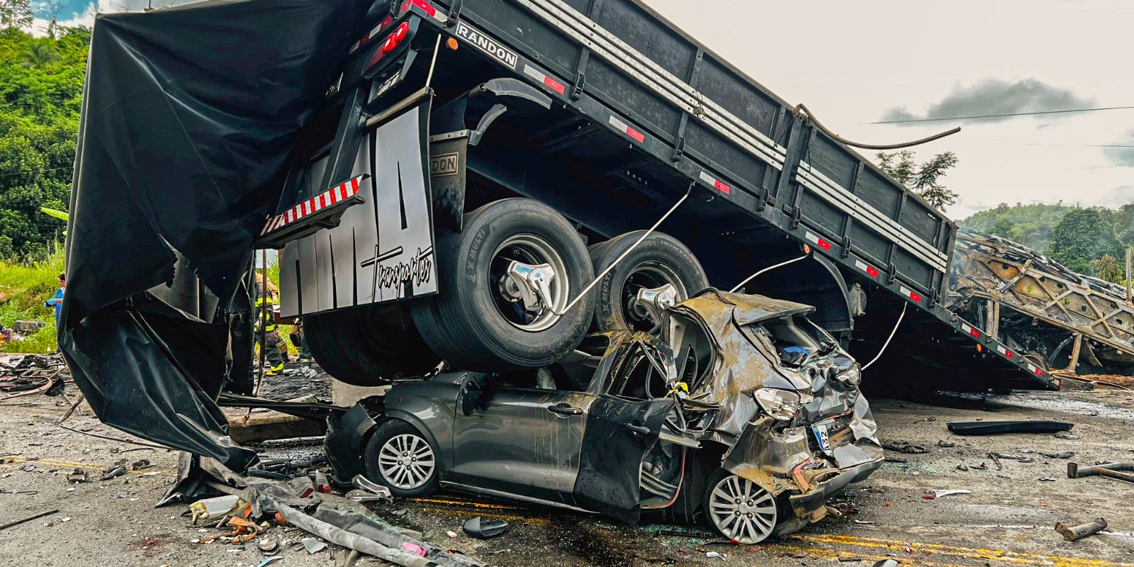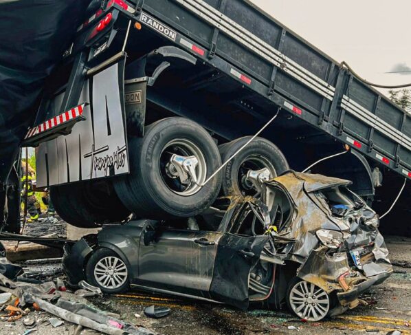O acidente ocorreu na madrugada deste sábado (21) na BR-116. Segundo informações preliminares da PRF, um granito que estava sendo carregado pela carreta se desprendeu e atingiu um ônibus de turismo, provocando um incêndio no coletivo. Um carro se chocou contra a carreta em seguida.